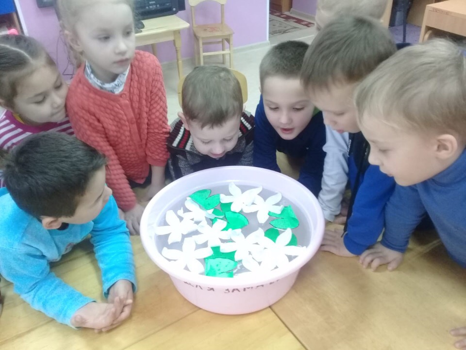 В завершении мероприятия воспитатели группы провели игру – эксперимент «Распустились цветы». Ребята вырезали водяные лилии из бумаги, закручивали лепестки и отпускали цветы в воду.
